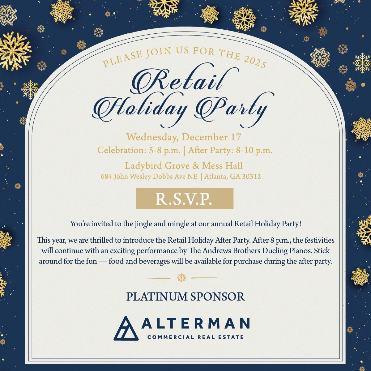 ACRE is proud to once again serve as a Platinum sponsor for the 2025 Retail Holiday Happy Hour hosted by Arnall Golden Gregory LLP, Franklin Street, and Westbrook Real Estate. We can’t wait to mix and mingle and celebrate the holidays with our colleagues in the retail industry on December 17 from 5-8 p.m. at Ladybird Grove & Mess Hall in Atlanta. We hope to see you there!